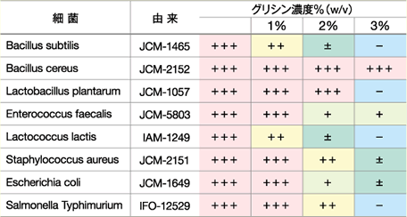 | グリシンの添加量を2%程度に増やすことでBacillus以外の菌の増殖も抑制可能になります。 上記は培地上での試験ですが、実際の食品では糖類などによる水分活性低下とも相乗作用があるので、培地上では効果の弱い菌に対しても静菌作用を発揮し、より広い静菌スペクトルを示します。 |